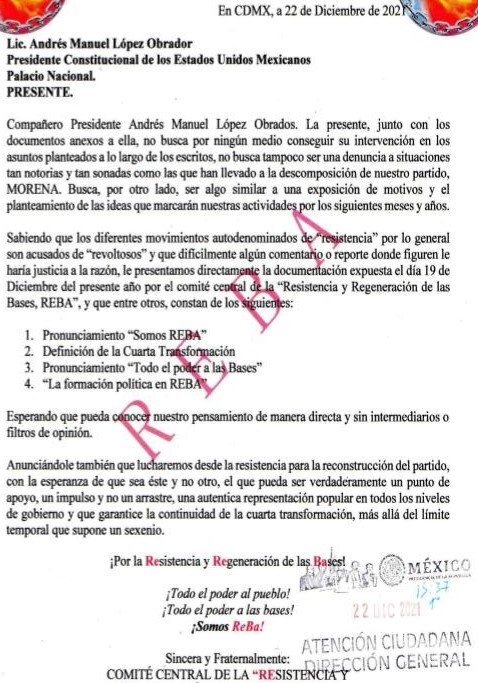 El sentido de la primer carta entregada en palacio nacional no fue pedir ayuda o una intervención en la vida del partido, fue anunciar las causas e ideología de un movimiento de resistencia con el fin de evitar calumnias, en un momento en que